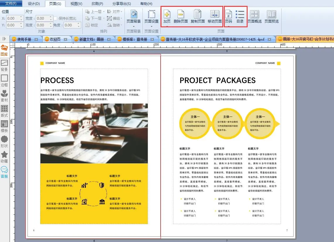 3、依照封底和封面的方法编辑内页,金印客排版软件可以方便的加页、删页、移动页和复制页,一直加到我们需要的页数。完成全部页面的排版后,再操作页码和目录。