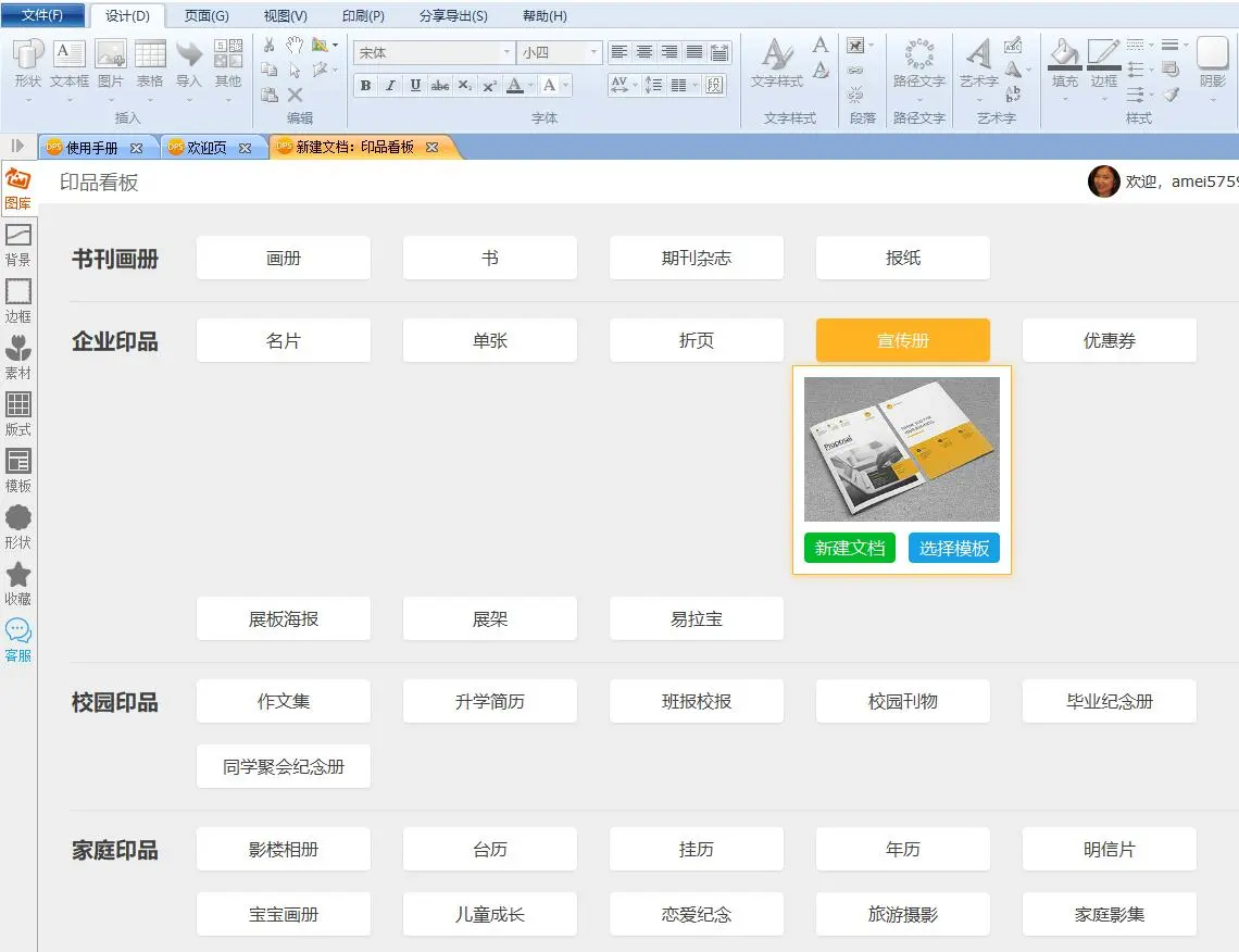 双击打开,选择主界面【新建】,会进入一个文档格式选择的窗口。这里可以选择的文件类型有画册、书、作文集、升学简历、报纸、校报手抄报、毕业纪念册等二十几个品种,选择【企业印品】——【宣传册】