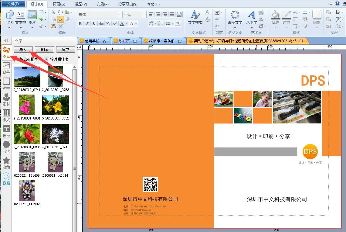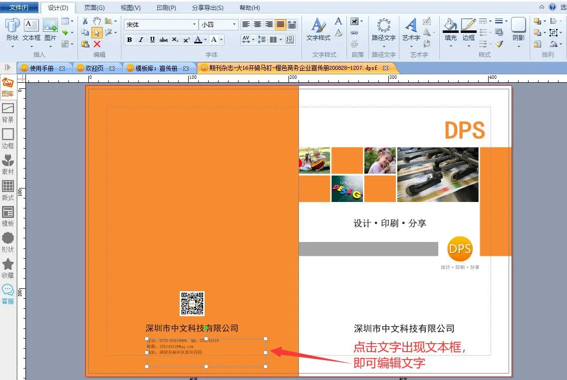 进入编辑页面后,我们按照模板的顺序先编辑封底和封面,将模板上的公司名称、企业LOGO、网址、二维码、地址电话等信息全部替换成我们自己的。