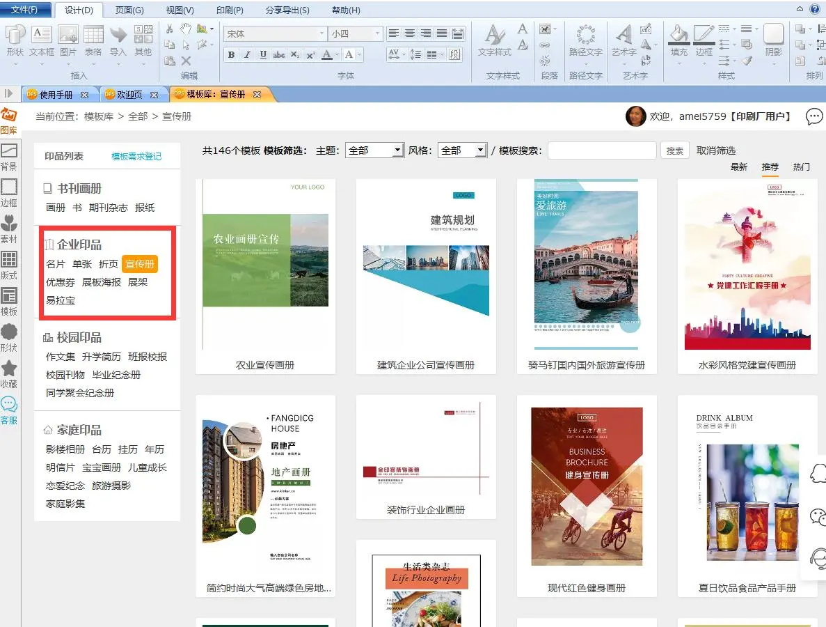 下载并打开金印客排版软件,进入模板库,找到企业印品,可以看到,里面有宣传册、折页、单张、展架等企业常用的模板。