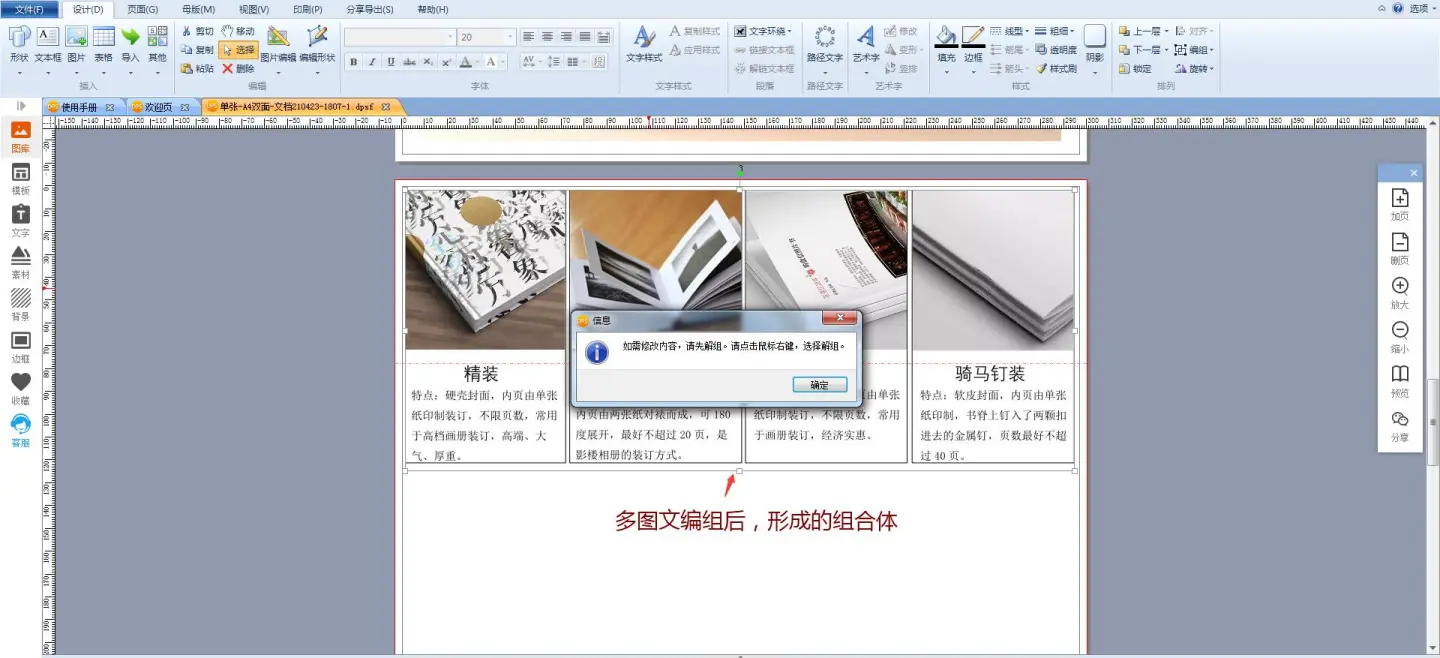 如果要对组合中的元素进行修改,双击组合体,会提示需要先解组,后修改。很好提示了用户该怎么做。