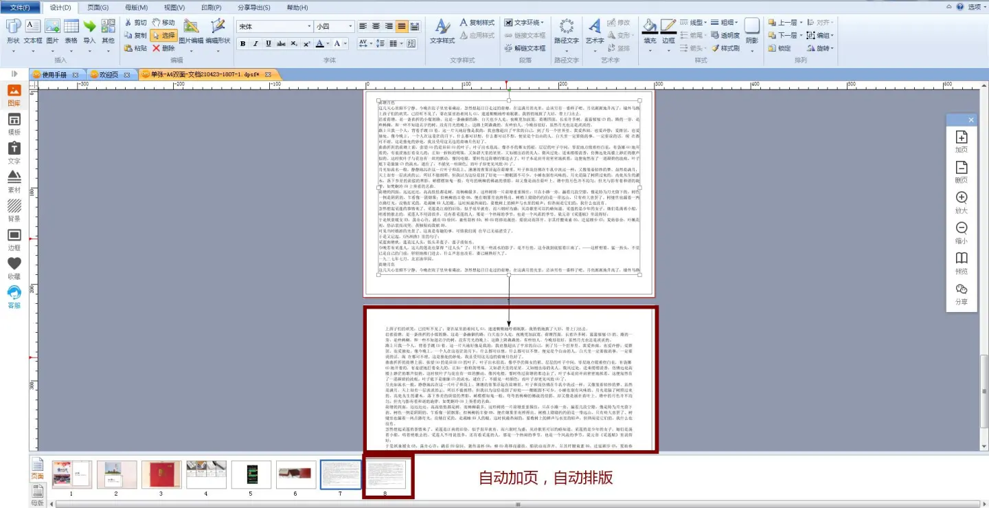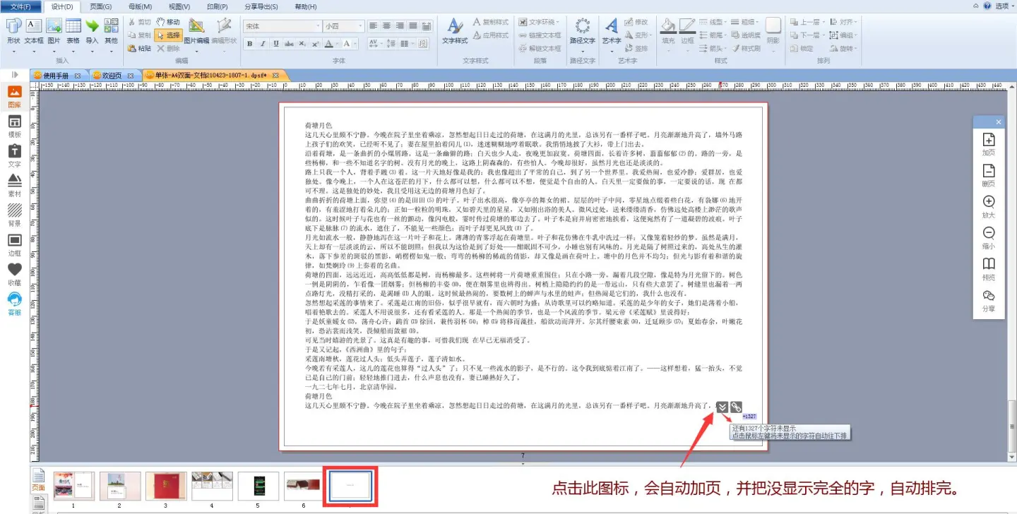 文本框显示,还有1000多字没排完,点击此图标,会自动加页,并把没显示完全的字,自动排完。