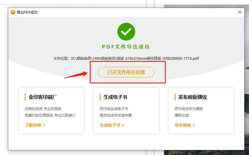 导出PDF成功后,页面会显示PDF文件位置,并可点击按钮打开文件所在文件夹
