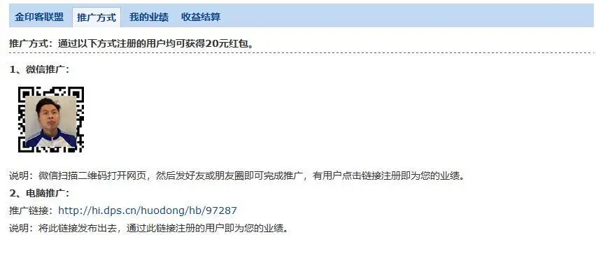 推广链接://hi.dps.cn/huodong/hb/97287(每个人的链接不一样),将链接发布出去,通过链接注册的用户即为您的业绩。