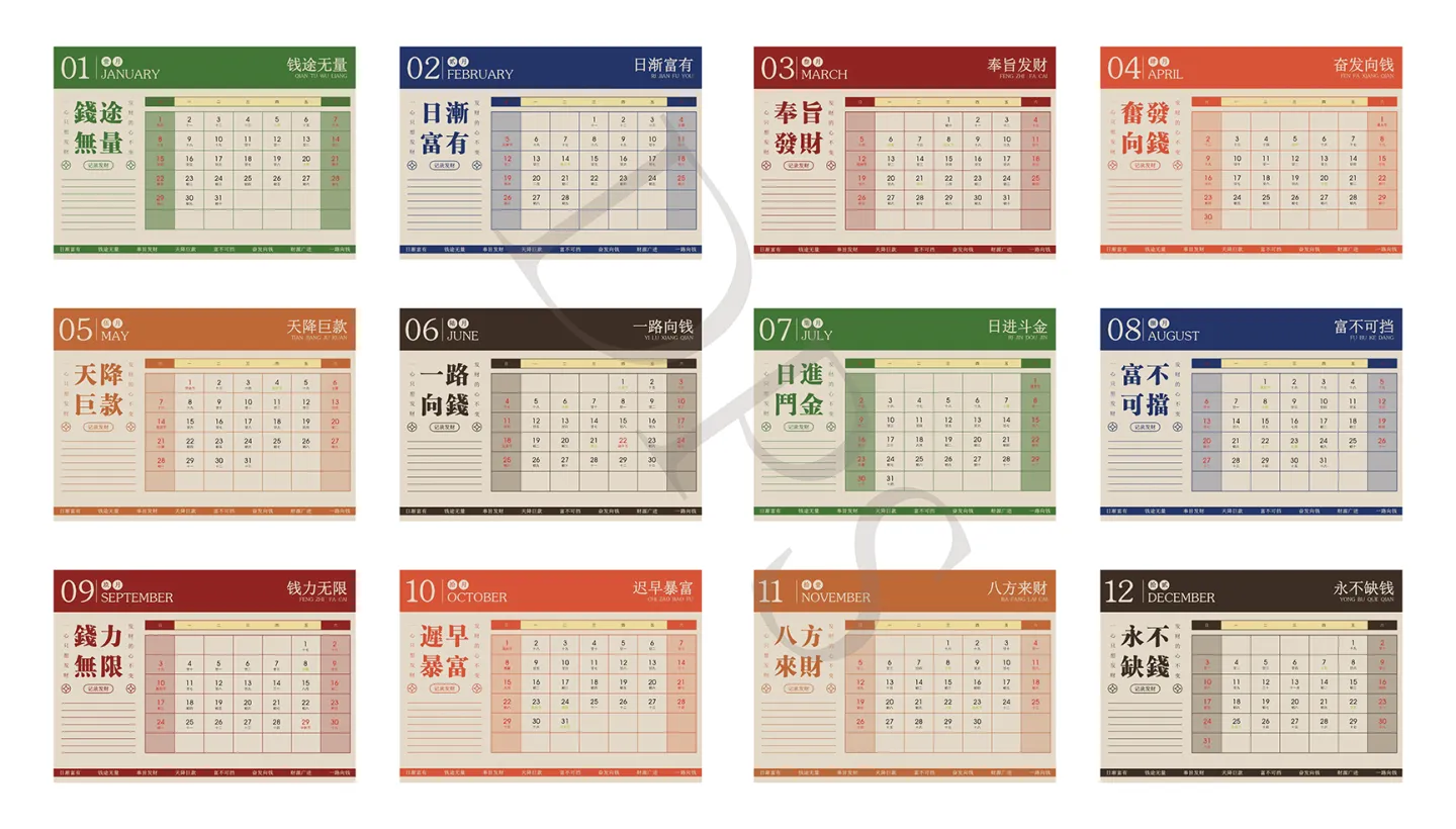 小印看到这一款时就超喜欢,这简直是可以提升幸福感的办公好物,是打工人的心头爱。看到每个月份的标题,比如一月的“钱途无量”、二月的“日渐富有”等等,都会感觉未来可期。如果我们把这本台历放在办公桌上,记录工作计划的时候也会动力满满的吧!