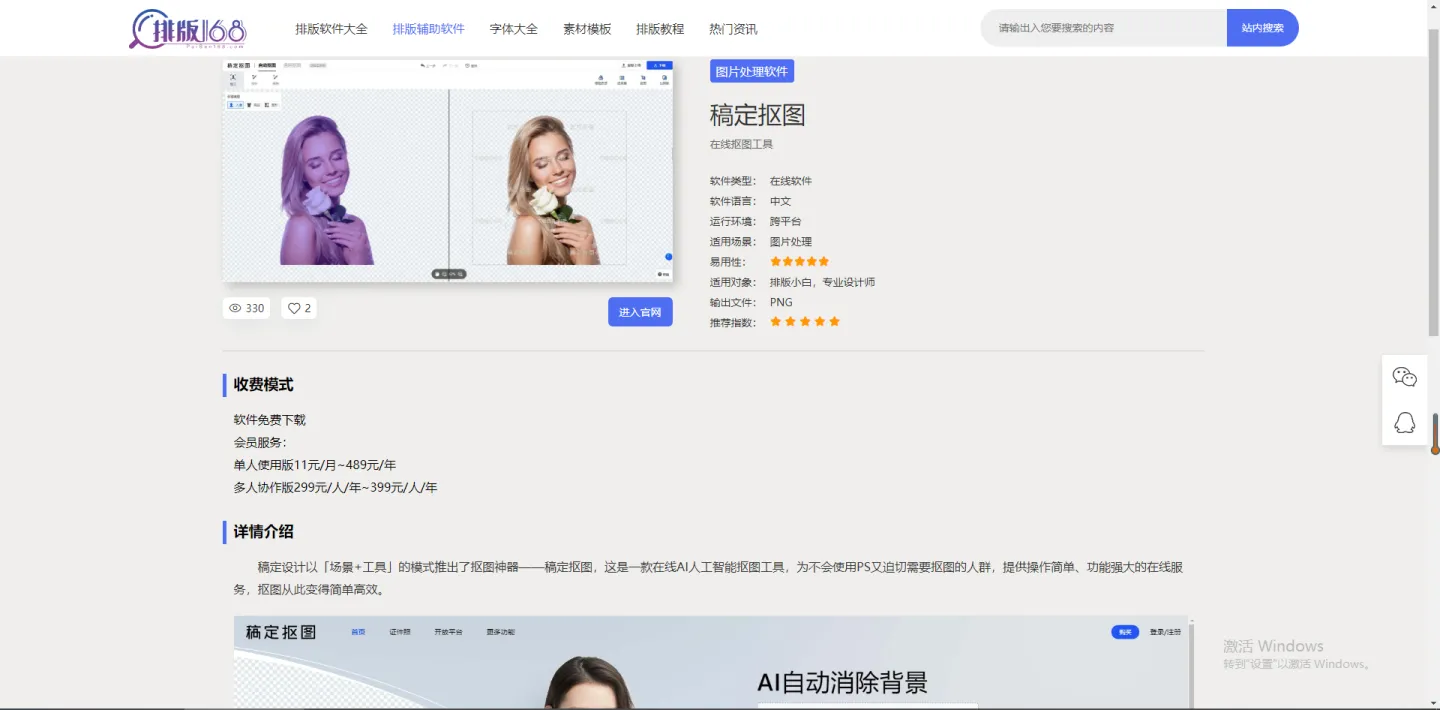 通过这个界面,我们看到了“稿定抠图”的软件类型、语言、运行环境,看到它的官网链接、图文并茂的软件介绍,甚至还可以看到它的收费模式。咱们可以了解到,“稿定抠图”操作简单,功能强大,可以满足不会使用PS又追求抠图质量的人群,真不愧是图片处理软件中的热度第一!