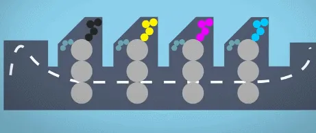 对应CMYK四种颜色,分装在四个机组上,控制不同颜色的着墨部分和着墨程度,达成配色。