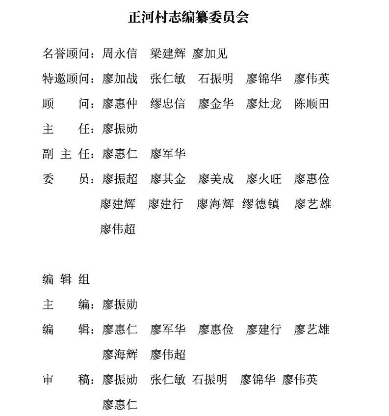 组织是执行的保障,在廖老先生的带领下,成立了《正河村志》编纂委员会,聘请了名誉顾问、特邀顾问,保障志书的学术高度,成立编辑组,明确了主编、编辑、审稿人员,设立了资料收集组,广泛收集文字图片资料。