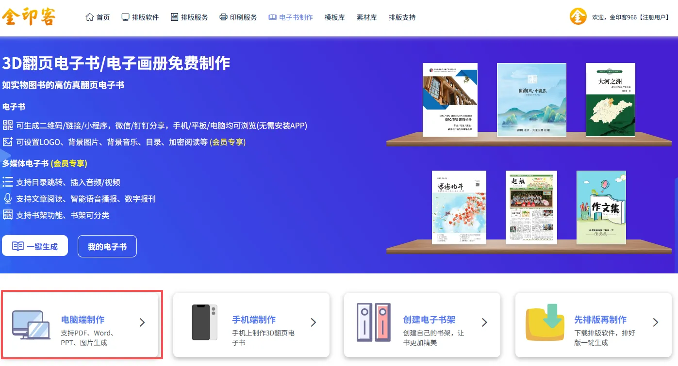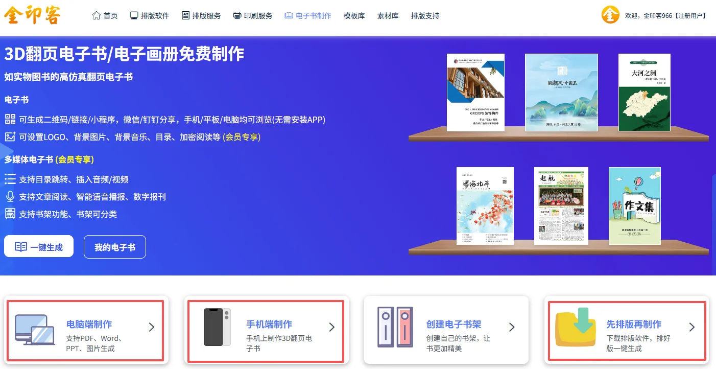 利用就“金印客智能高效多用途排版系统”,先排版,再一键生成3D翻页电子书,或者制作多媒体电子书。