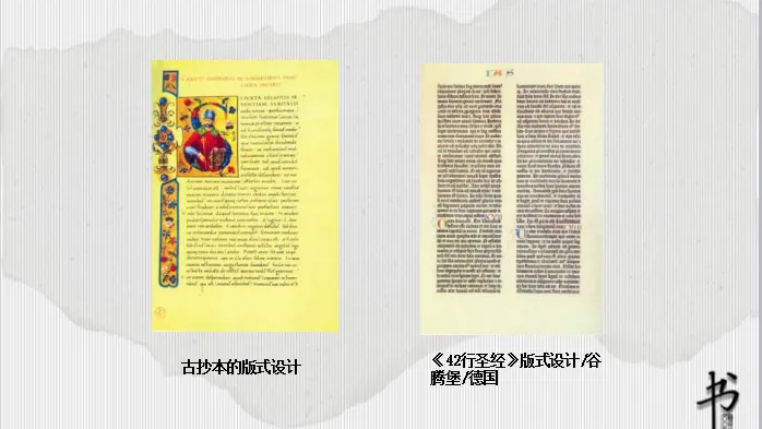 自五百多年前,德国人谷腾堡确定的欧洲书籍艺术以来,至今仍处于主要地位的是古典版式设计。这是一种以订口为轴心左右页对称的形式。内文版式有严格的限定,字距、行距有统一的尺寸标准,天头、地脚、内外白边均按照一定的比例关系组成一个保护性的框子。文字油墨深浅和嵌入版心内图片的黑白关系都有严格的对应标准。