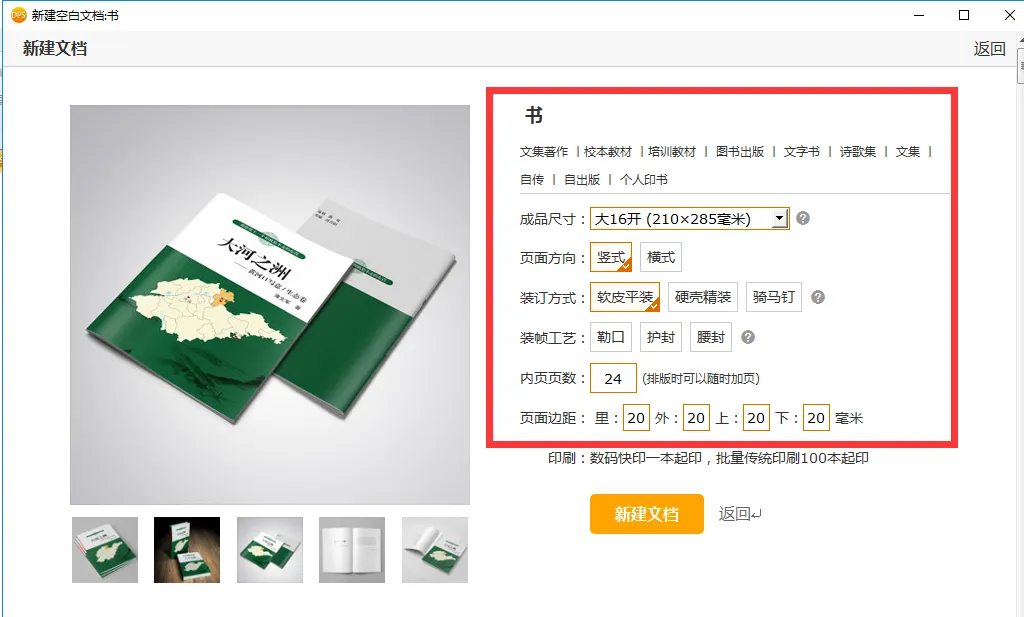 打开【书】,就会出现下面这个参数页面,包括成品尺寸、页面方向、装订方式、装帧工艺、内页页数和页面边距。
