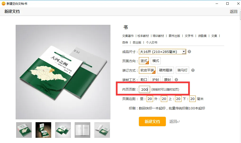 我们可以依据自己的需求,对参数进行修改。比如修改尺寸、或者装订方式,选择装帧工艺等。设置好这些参数之后,我们再根据自己要排版的书籍的文字内容,修改内页的页数。比如,我要做的一本书预估页数为200页,我就将内页页数修改为200页。