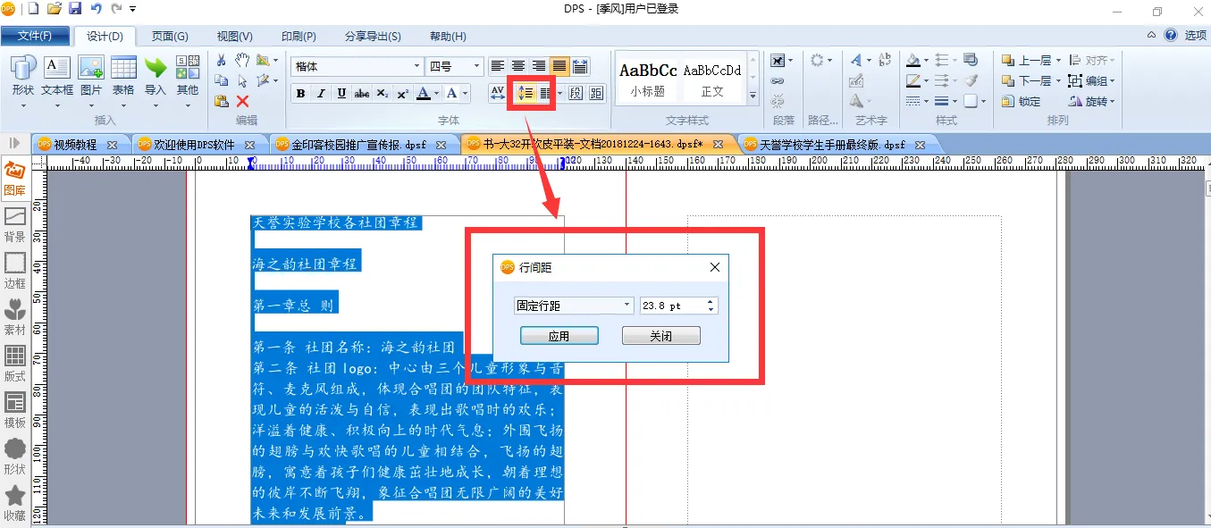 接着对内容进行字体和间距的修改。比如字体改为楷体四号,间距改为固定行距23.8pt。(不同文本有不同的需求)