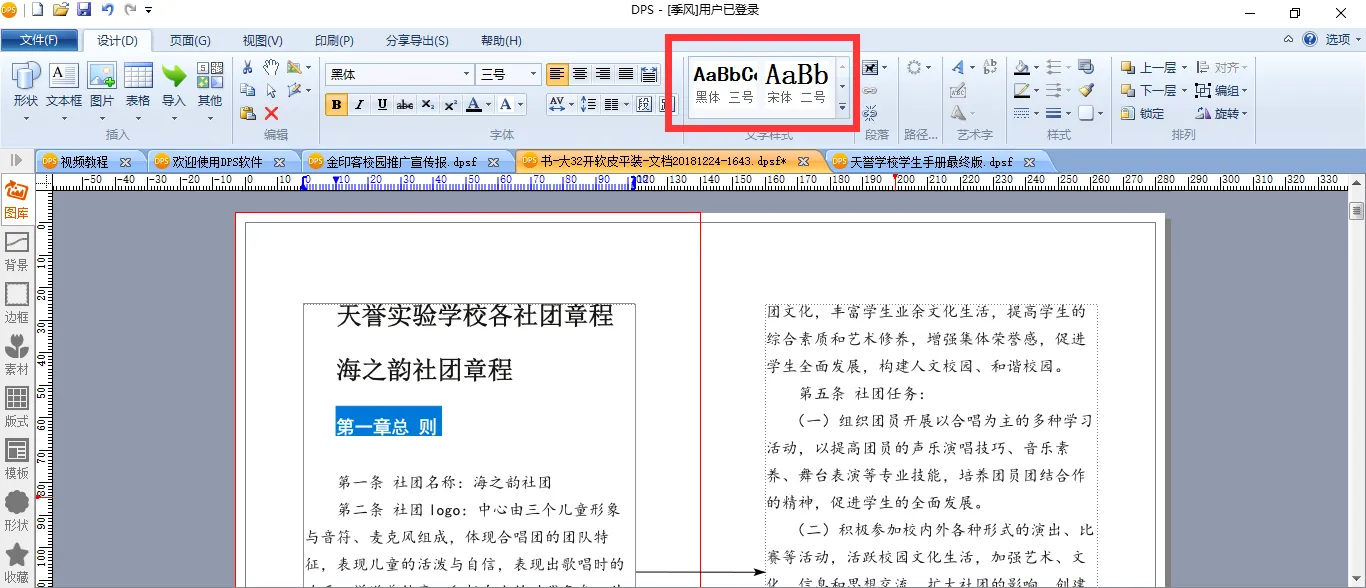 由于每章标题的字体字号相同,为了方便,我们可以将宋体二号加粗和黑体三号加粗这两种文字样式加入到编辑栏的【文字样式】之中。具体方法很简单,选中修改过的标题,然后点击鼠标右键,选择【加入文字样式】就可以了。这时【文字样式】中就能看到新添加的文字样式了。这是只需选中其它要修改的标题,点击对应的文字样式就可以了,非常方便。