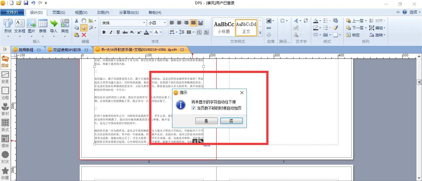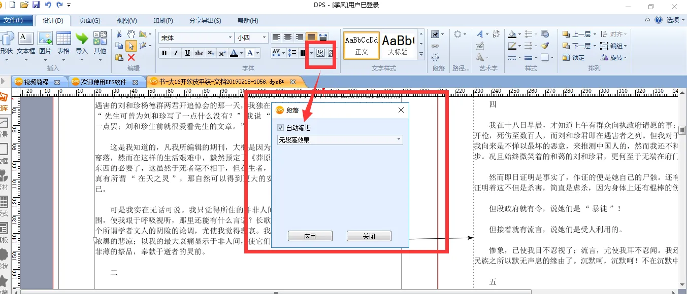 书籍的排版和网络文章不同,排版时需要对文字进行首行缩进。首行缩进的方法很简单,我们只需在上方编辑栏中找到【段】,然后勾选【自动缩进】即可。