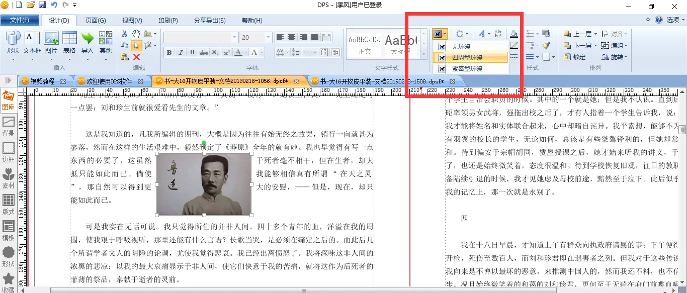 光插入图片还没完,找到编辑栏上方红框中的按钮,可选择四周型环绕或紧密型环绕,这样当文字变动时,图片就不会覆盖文字了。