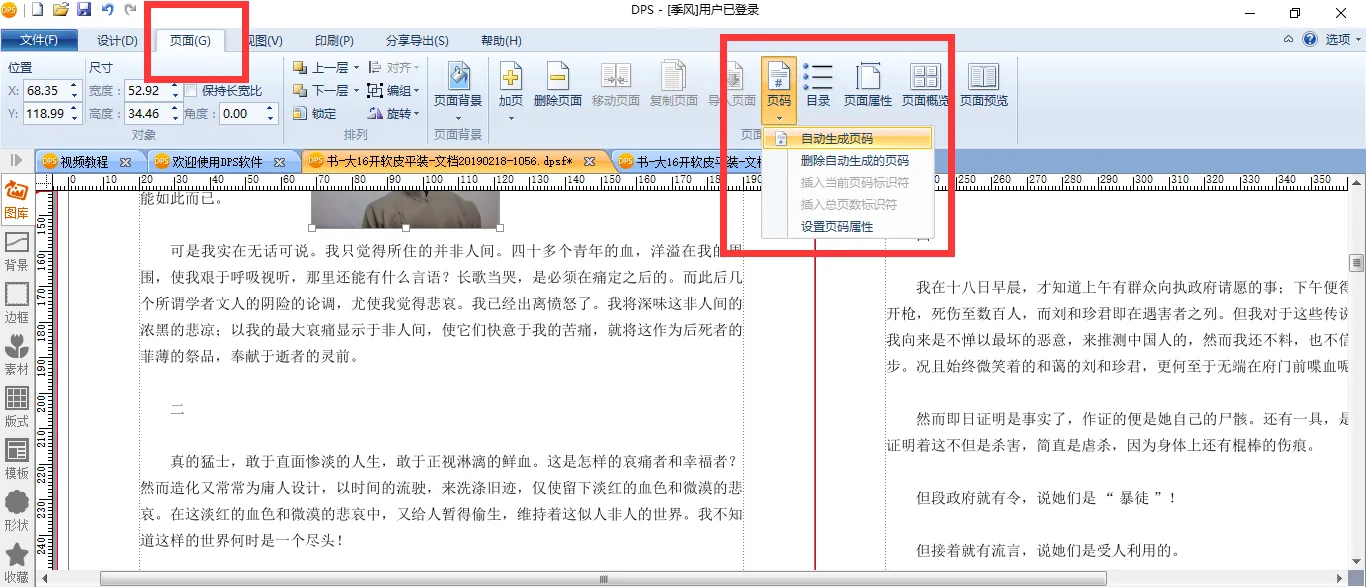 文章内容编辑好后需要插入页码,在编辑栏【页面】中找到【页码】,并选择自动插入页码。