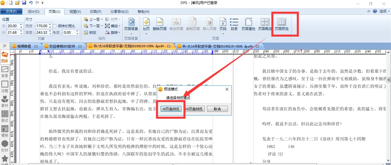 在【页面】中找到【页面概览】,然后选择3D预览即可。