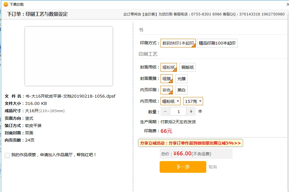 作品排版完成之后,不用找印刷厂印刷。DPS软件内置印刷下单系统,软件内下单,即有印刷厂将您的作品制作成精美的印刷作品,并快递送货上门。
