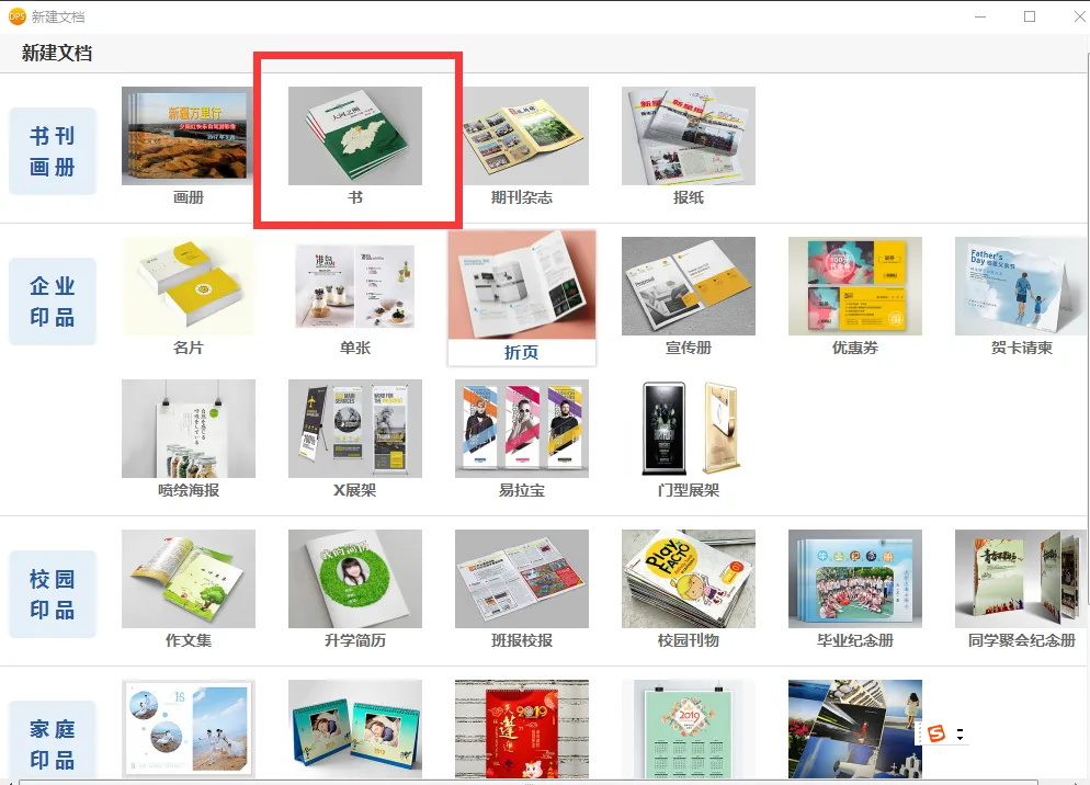 使用DPS排版个人文集的方法非常简单,在电脑上安装了DPS设计排版印刷分享软件后,双击打开,选择主界面【新建】,会进入一个文档格式选择的窗口。这里可以选择的文件类型有画册、书、作文集、升学简历、报纸、校报手抄报、毕业纪念册等三十几种,选择【书】