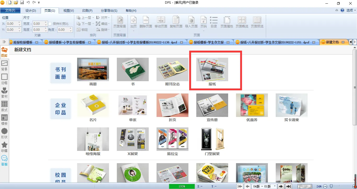 用DPS制作校园报有两种方法,第一种是在软件内新建文档,自己按照报刊的格式,制作报头、报眉等基本样式。在电脑上安装了DPS设计印刷分享软件后,双击打开,选择主界面【新建】,会进入一个文档格式选择的窗口,选择【报纸】,既可以自行创作了。