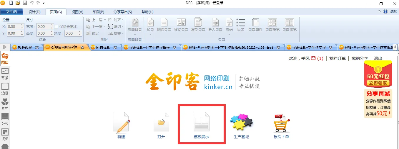 还有另外一种更简单的方法,就是使用金印客DPS设计排版印刷分享软件内的报纸模板,轻松套用,更省时省力,也更专业美观。在软件主界面找到【模板展示】
