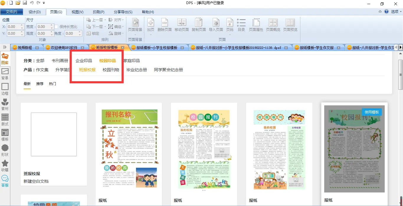 打开后【模板展示】后,在分类和产品中选择【校园印品】——【班报校报】,就会发现很多不同的校园报模板。