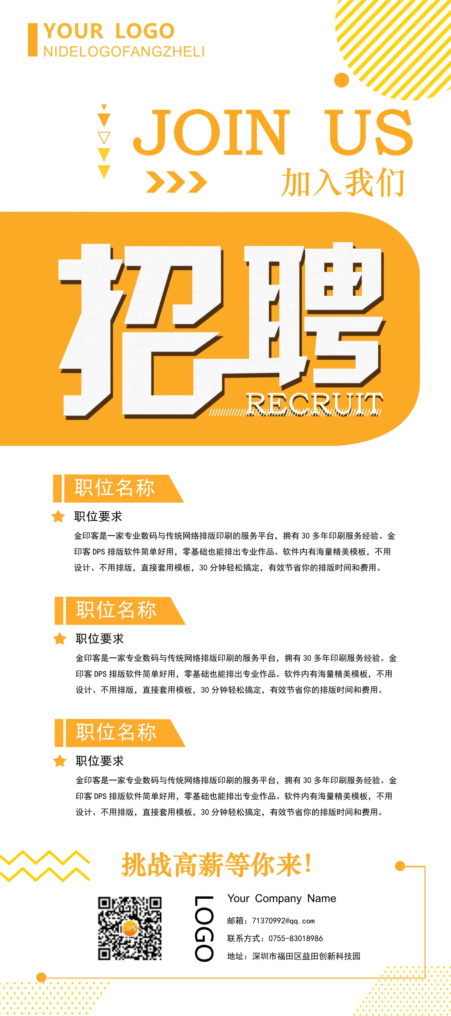 以上模板都有易拉宝和展架两种,使用DPS设计排版印刷分享软件,即可以免费套用模板。不用请设计师自己设计,只需修改模板内容,就能轻松做出理想的招聘海报。