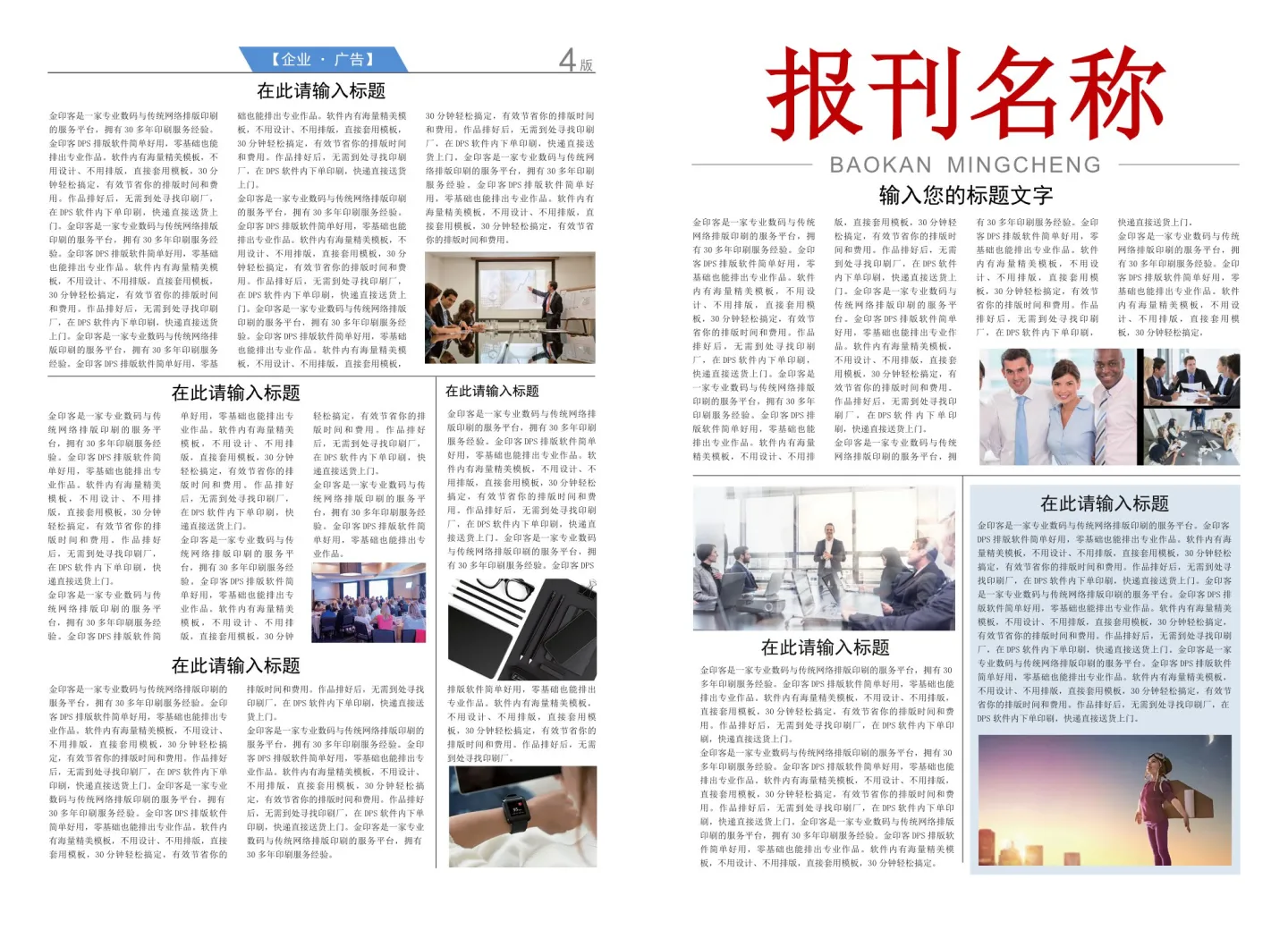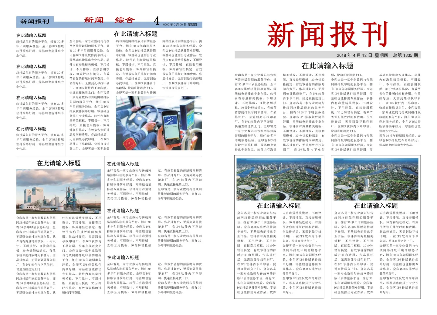 没错啦,金印客DPS设计排版软件的杀手锏就是,为你准备了大量的报纸模板!你不用自己排版设计,只要将准备好的文字和图片插入到现成的报纸模板中就行了!