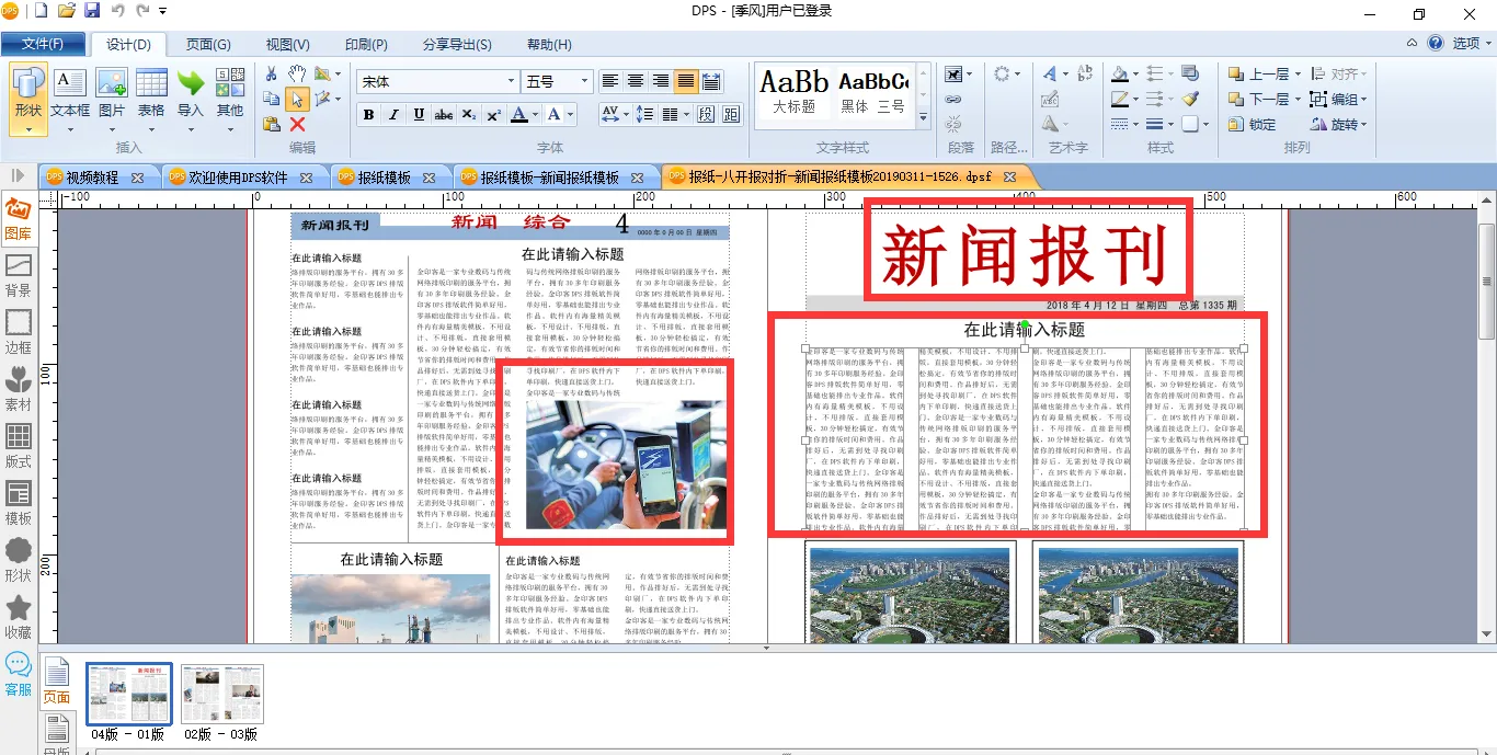 所有报纸的报头、报眉、包括栏目的样式都已经全部设计好了,你只需要选中报纸模板,将其在DPS软件内打开,将需要的文字和图片填充其中即可。正文、标题、图片都可以轻松修改。