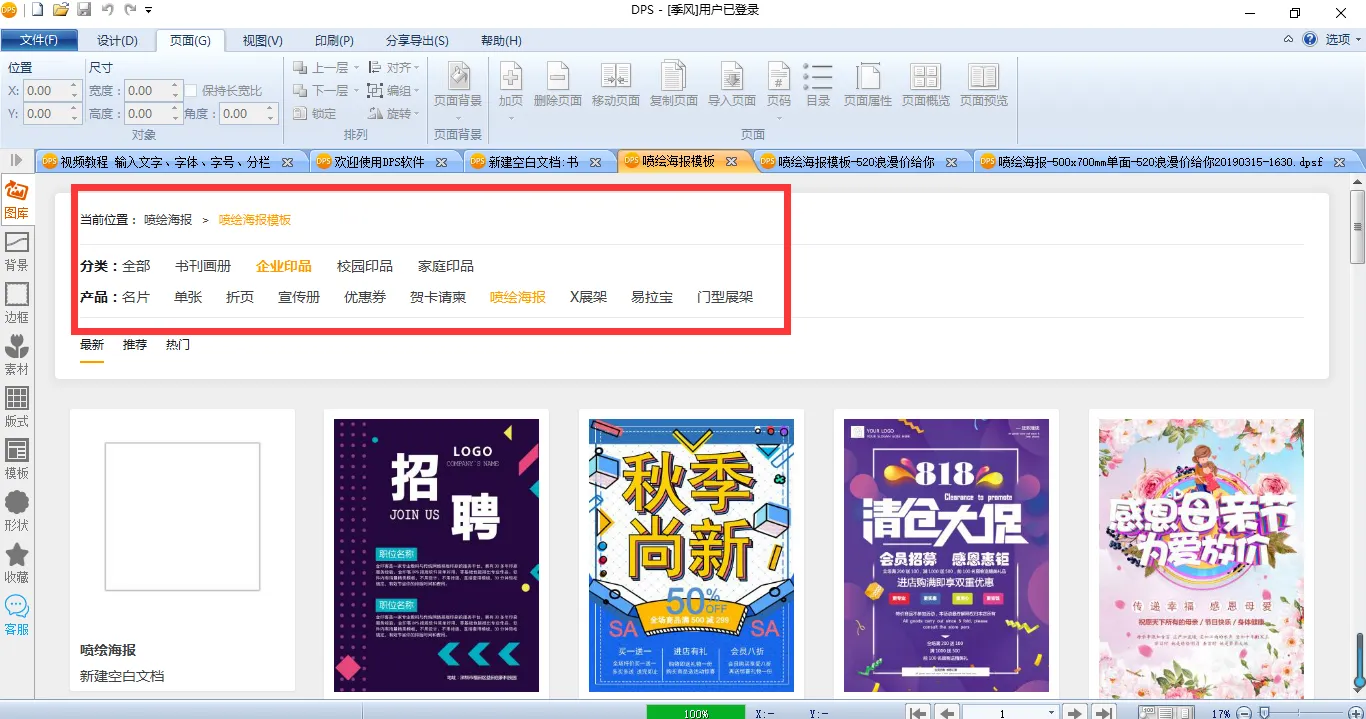 下载金印客DPS设计排版印刷分享软件后,点击【模板展示】,选择【企业印品】——【喷绘海报】,就可以找到海报模板。