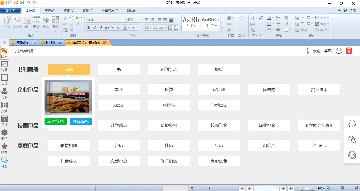 打开【新建】,发现新建的样式文档选择页面也做了很大的调整。页面看板将文字与图片合而为一,原先的两屏缩减为一屏。将鼠标放在文字上,就可以看到图片,同时还可以选择【新建文档】或【选择模板】。