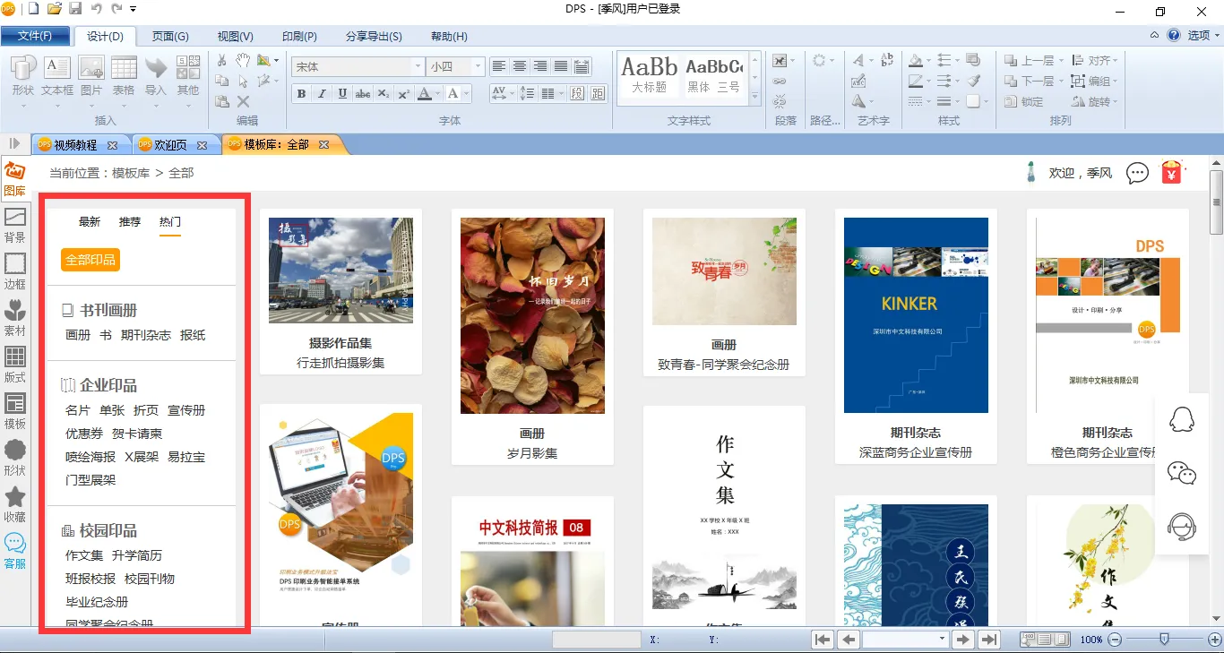 【模板库】的页面也做了大的调整。软件左侧对模板种类进行了详细清晰的分类,可以按照印品种类来寻找模板。同时还能按照“最新”、“推荐”和“热门”给模板进行排序,帮你找到合适的优质模板。