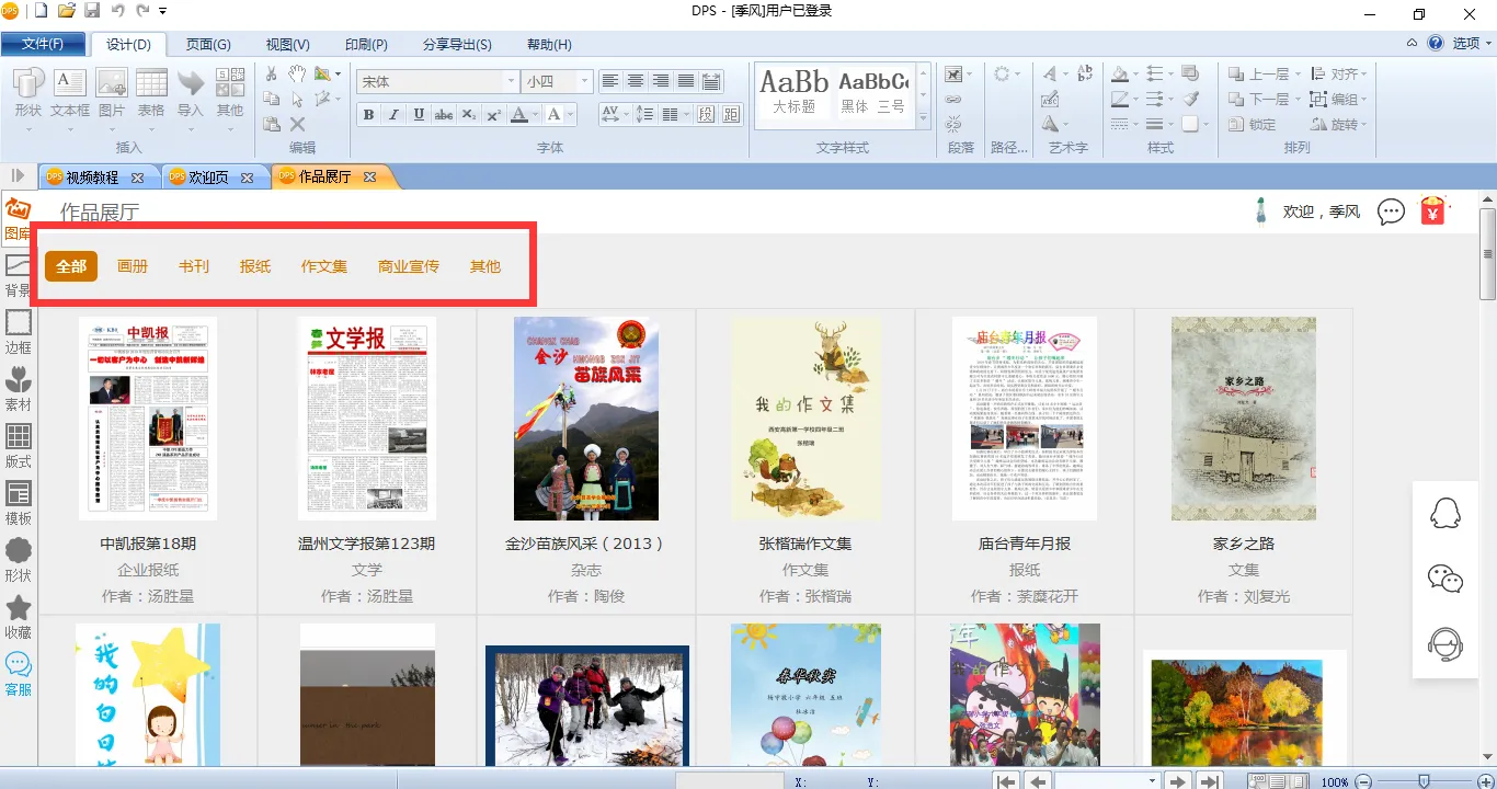 打开【作品展厅】后,就可以看到部分DPS用户上传的作品。你可以根据画册、书刊等分类找到对应的作品,作为自己创作的参考和借鉴。