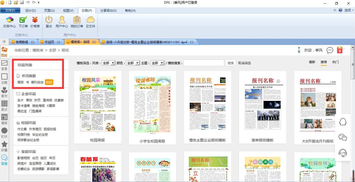 您只需在电脑上下载金印客DPS设计排版软件,打开【模板库】,在【书刊画册】中选择【报纸】,就能发现大量报纸模板。