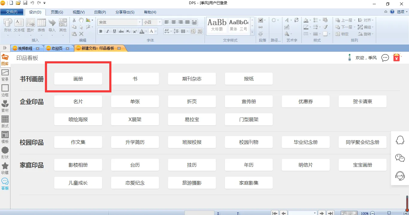 在电脑上打开软件后,点开【新建】按钮,会出现一个【印品看板】,里面有书籍、画册、报纸、宣传册、作文集、升学简历等30种印品品类可选,选择【画册】