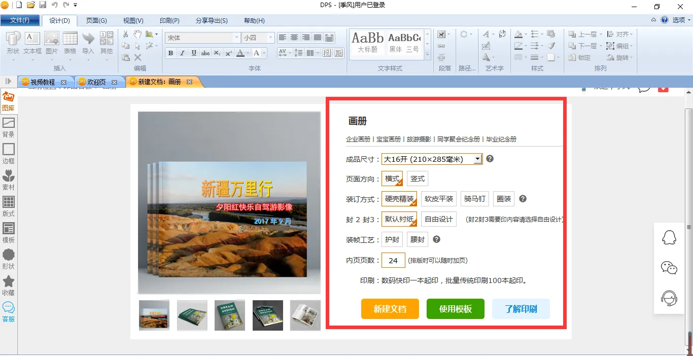 选择【新建文档】之后,会出来一个新建文档页面,可以对画册的制作参数进行选择,参数包括成品尺寸、页面方向、装订方式、页数等等。