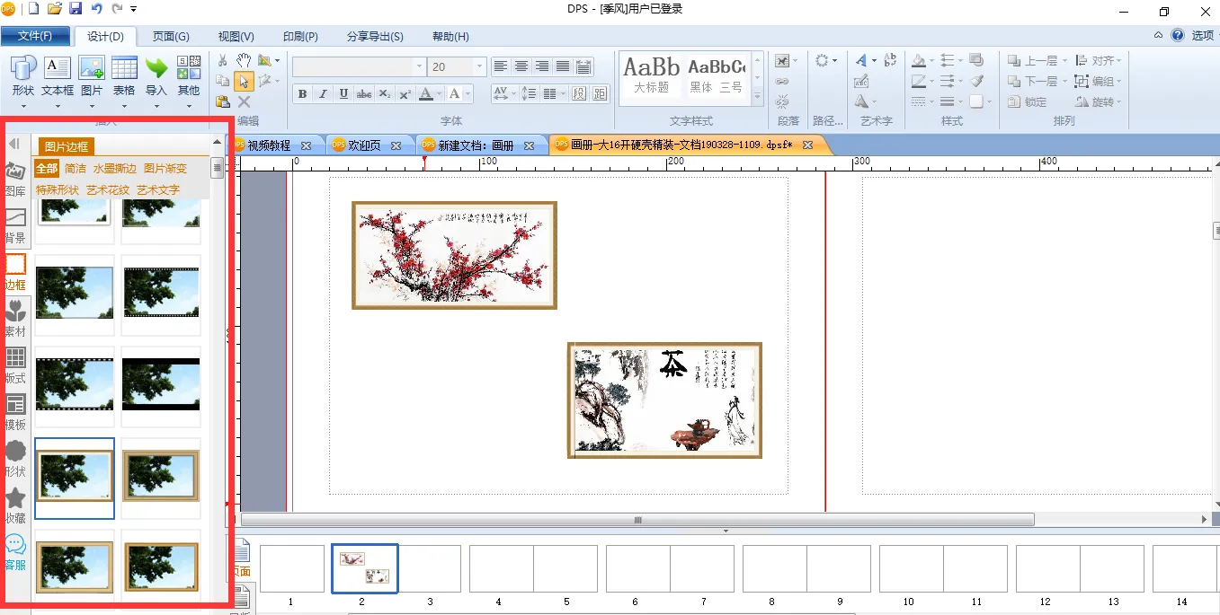 如果您不知道如何摆放图片,没关系,DPS软件内已经设计了不少页面版式,您只需在左侧编辑栏选择【版式】,然后将图片分别插入到边框之中即可。