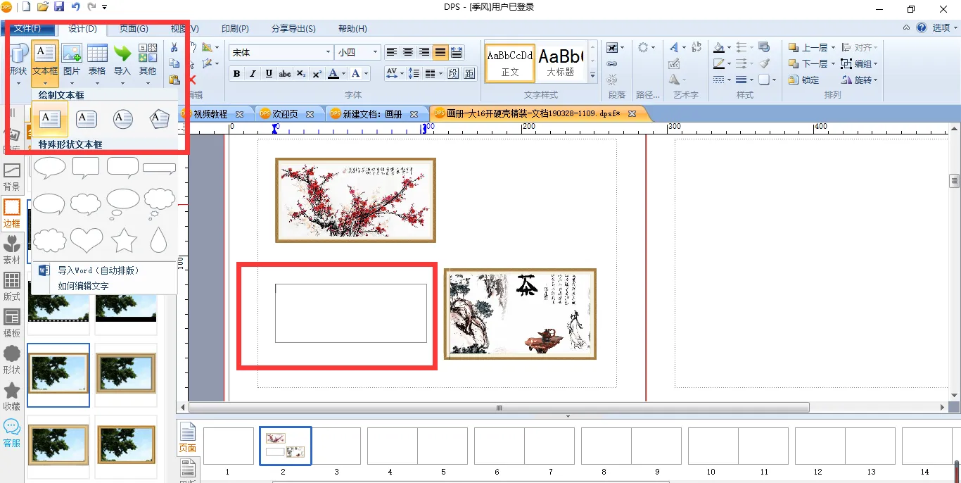 这里我选了一个其中一种类似木质感觉的边框,里面还有很多种其它边框,任由您选择。确定好图片位置和边框之后,在空白位置还可以添加文字,作为对作品的介绍。方法很简单,只要在编辑栏上方打开【文本框】,然后在空白处画一个方框即可。