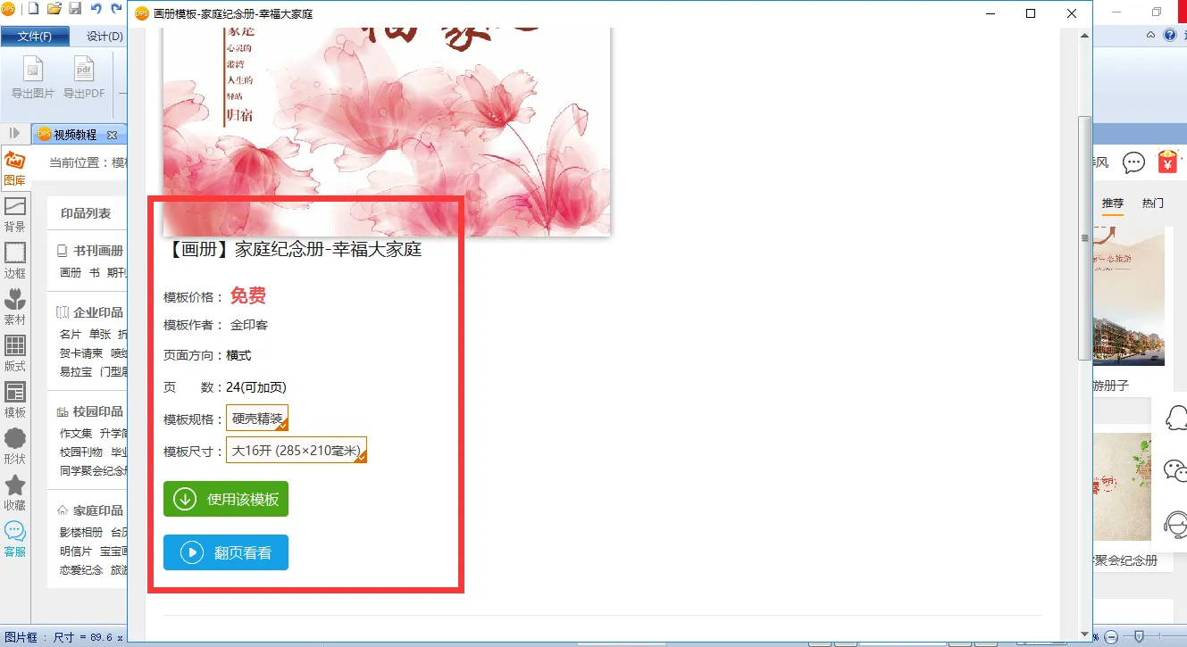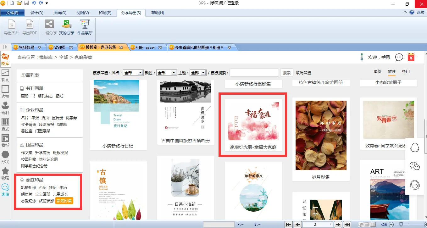 软件下载后,打开软件界面的【模板库】,在【家庭印品】中选择【家庭影集】,会发现里面有各式各样的家庭相册模板。我们找到选中的模板。