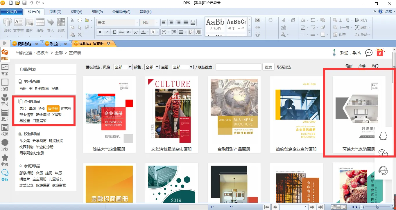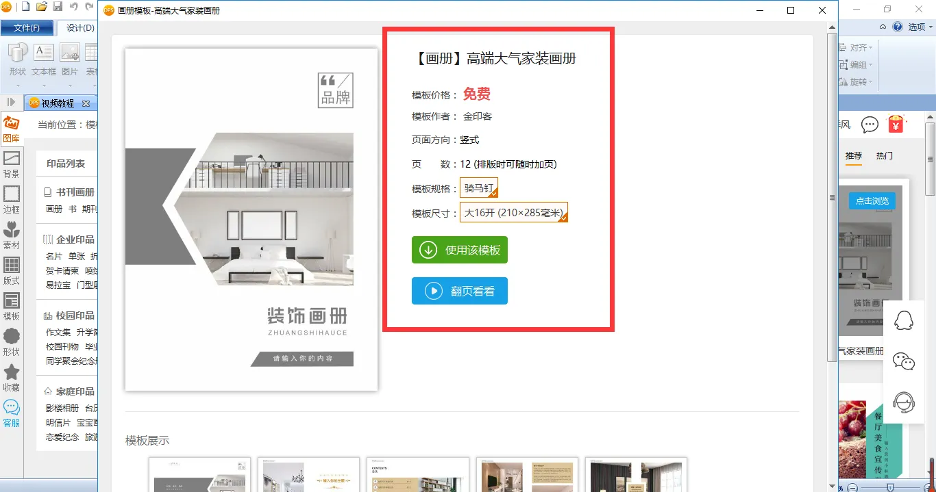 软件下载后,打开软件界面的【模板库】,在【企业印品】中选择【宣传册】,会发现里面有各式各样的宣传册模板。我们找到【家装画册】模板。