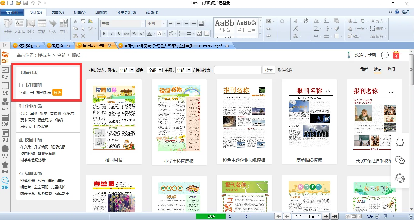 软件下载后,打开软件界面的【模板库】,在【书刊画册】中选择【报纸】,会发现里面有各式各样的报纸模板。