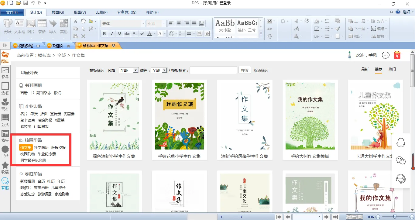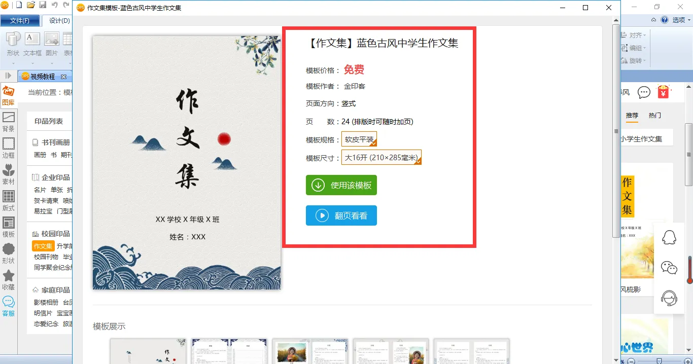软件下载后,打开软件界面的【模板库】,在【校园印品】中选择【作文集】,会发现里面有各式各样的作文集模板。