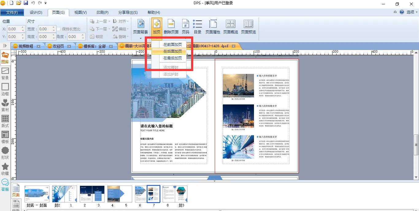 这里要提醒一下,如果遇到模板中页数不足的情况,可以选择【加页】,以满足实际的页面需求。这里给大家介绍一下加页的方法。将模板在金印客DPS设计排版印刷分享软件中打开后,我们选中要加页的页面,然后在编辑栏上方选择【页面】-【加页】-【在后面加页】。