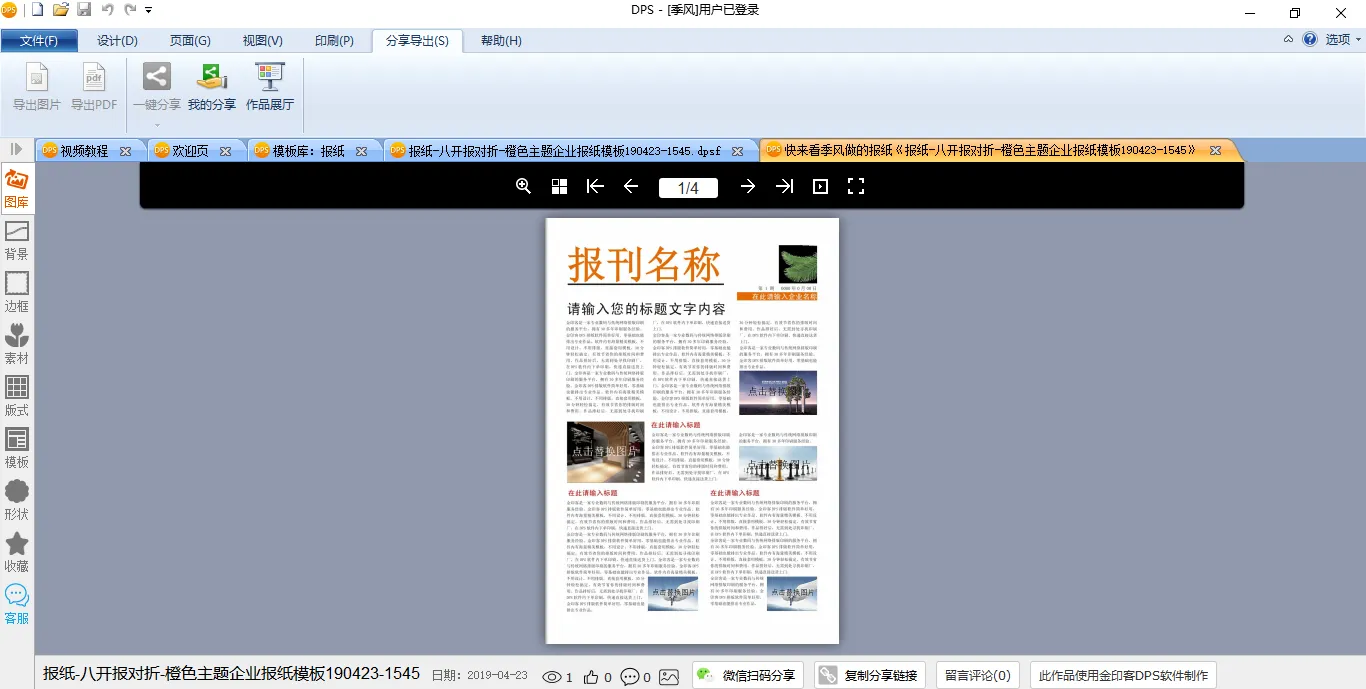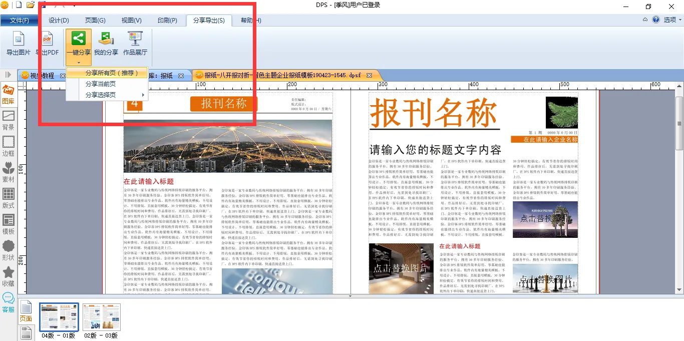 替换掉文字和图片,然后根据实际情况略做改动,一份由您亲手制作的报纸就大功告成了。这时您只需在编辑栏上方选择【分享导出】——【一键分享】——【分享所有页】,即可免费获得报纸的3D电子版,并分享给微信好友。