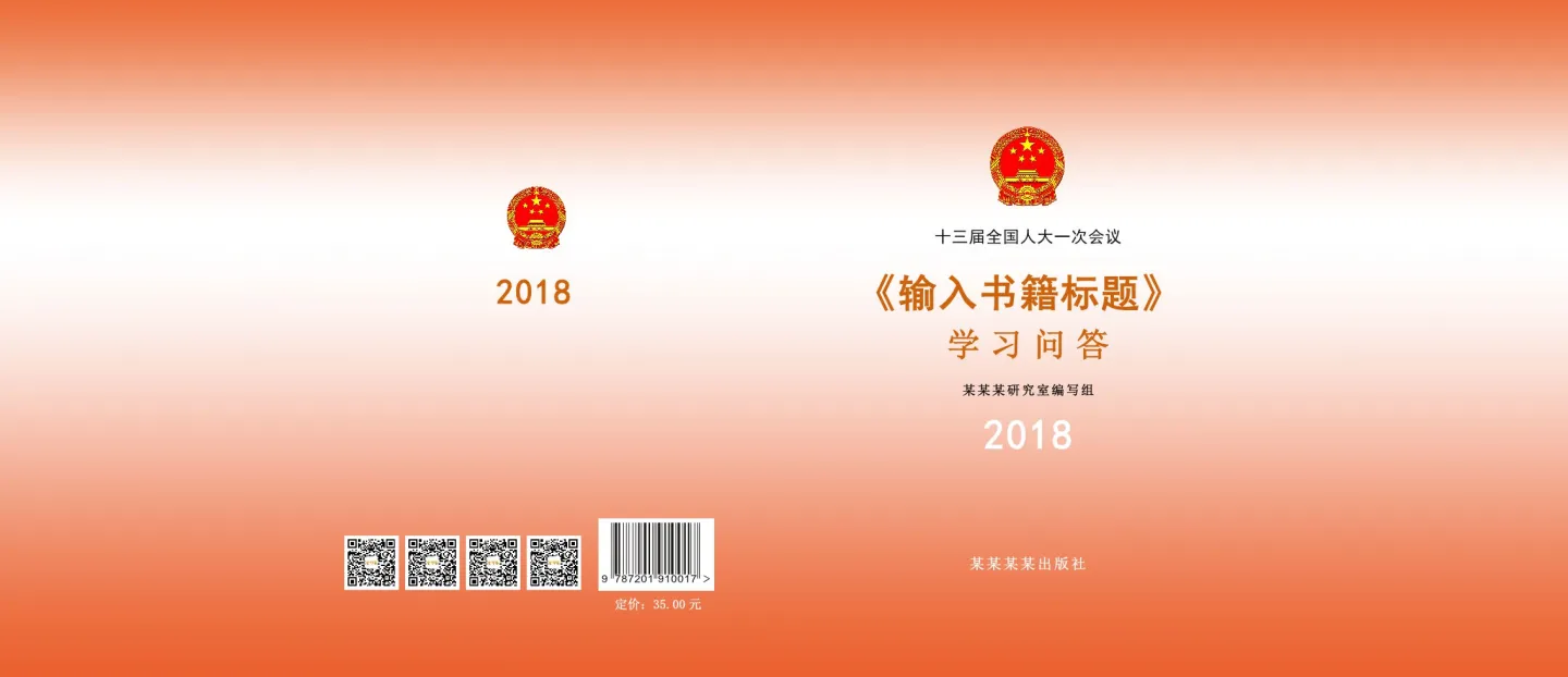 这是封面,橘红色背景加上国徽标志,是典型的党政读物封面。封面已经为您设计好,您只需要替换封面的标题、条形码、二维码等即可。