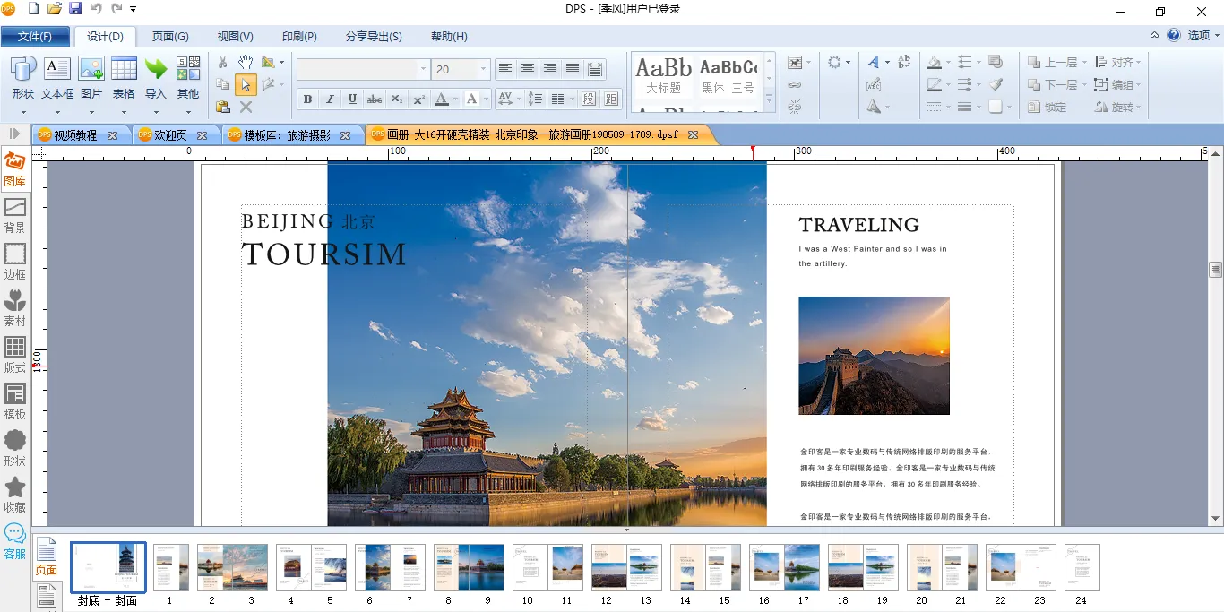 打开模板后,就可以对模板中的文字和图片内容进行替换和修改。将您精选的图片放入到模板中,然后配上简单的文字,一本由您亲手制作的高大上的旅游画册就完成了。