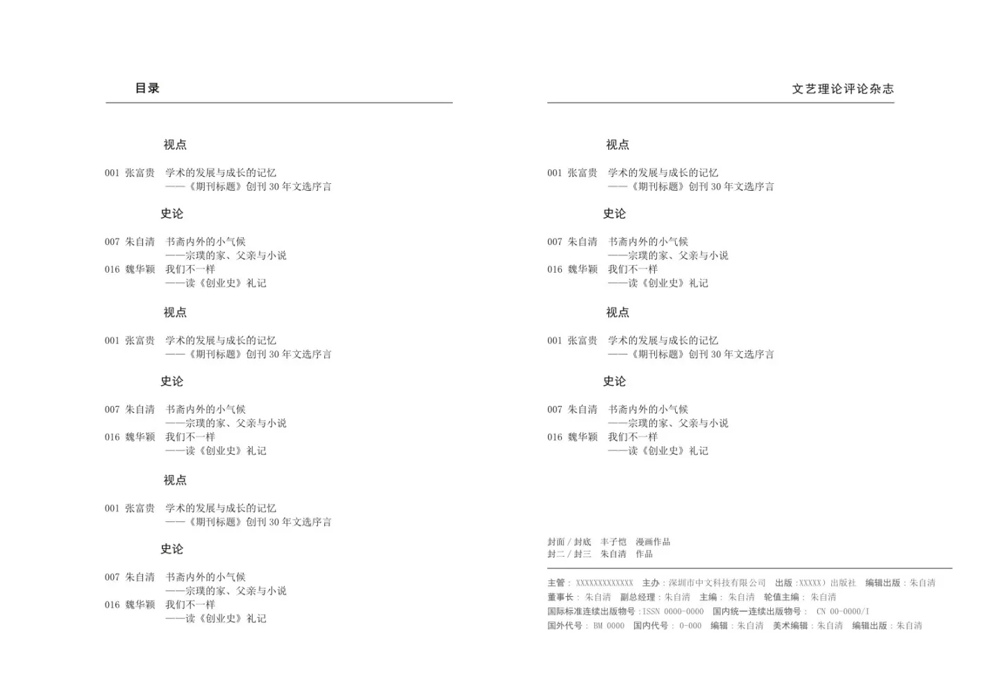 这是目录及版权页。目录也是我们按照一般的学术刊物的目录样式制作的,您可以直接采用这个目录样式,只需要修改目录文字和页码即可。或者您还可以根据自己的需要,自己设计和修改目录样式,也十分简单方便。另外,我们也制作好了版权页,您只需修改文字就好了。