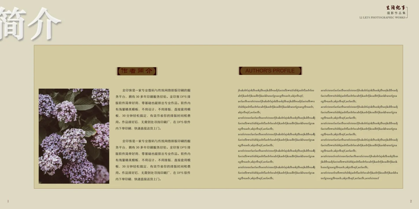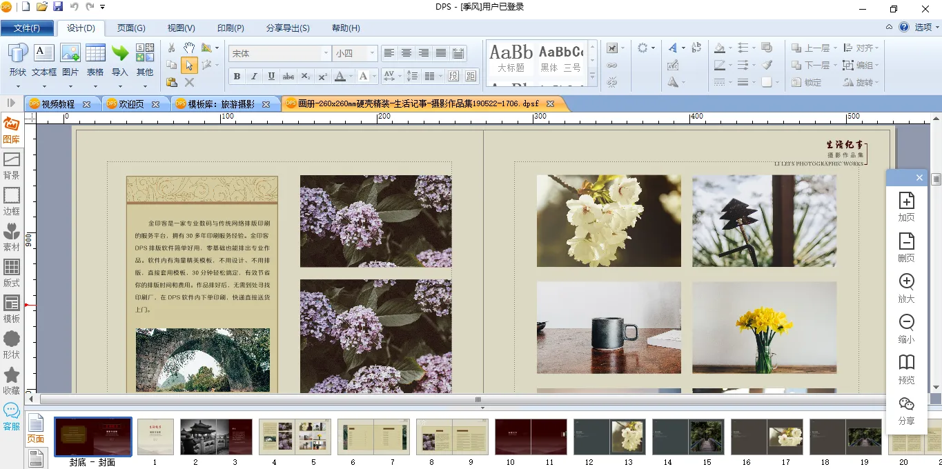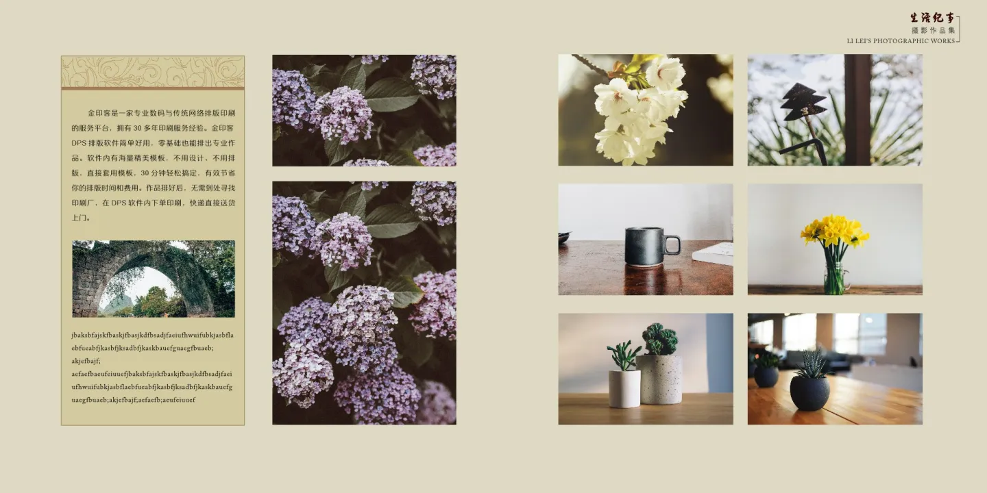 将模板在金印客DPS设计排版软件中打开后,就可以对模板内容进行编辑了。替换掉模板中的文字和内容,一本专属于你的摄影集就完成了。