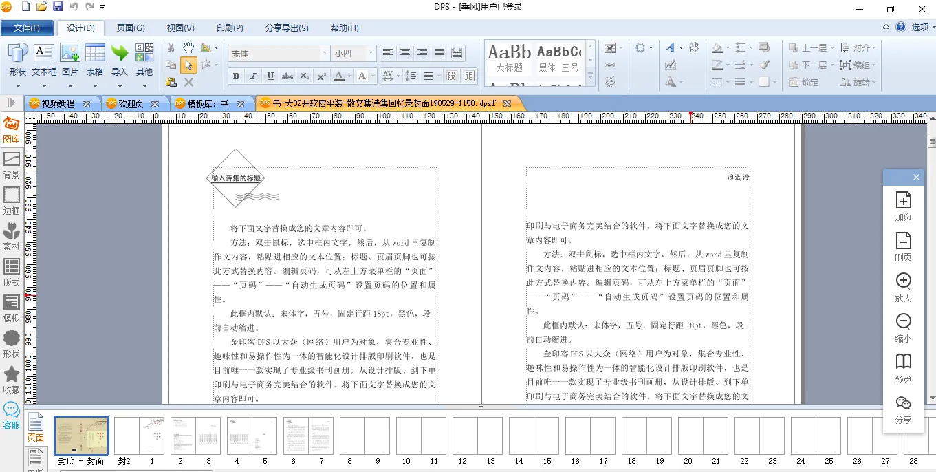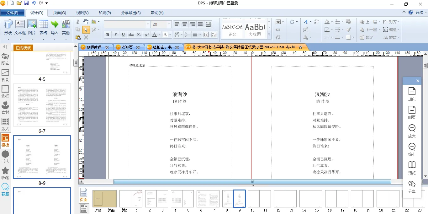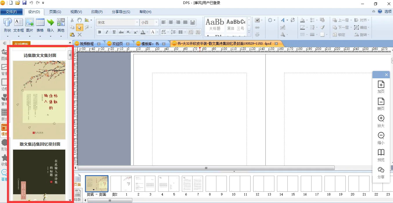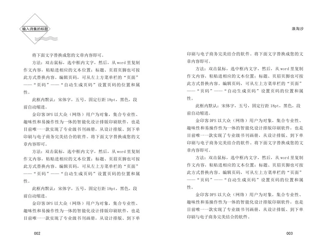 编辑的步骤完成后,接下来就是排版了。以往的书籍排版主要是依赖InDesign、Coredraw等排版软件,对专业水平要求高,普通人很难学会。现在,我教大家一个超级省时省力的排版方法,那就是直接套用金印客DPS设计排版印刷分享软件的散文集模板。先给大家看看这些模板都长什么样子:
